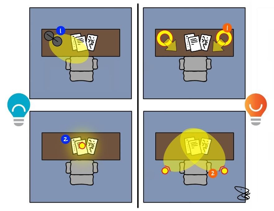 - Combine ambient + task lighting