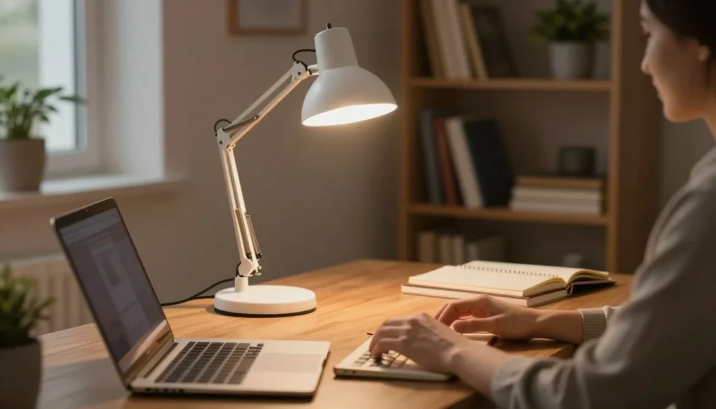 Your desk lamp should not be the only light source in the room. Combining task lighting with soft ambient lighting helps reduce contrast and eye fatigue.